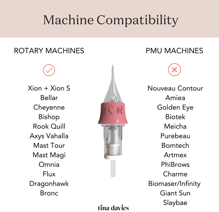 • Not compatible with the following PMU Machines/Devices: Nouveau Contour, Amiea, Golden Eye, Biotek, Bomtech, Meicha, Purebeau, Artmex, PhiBrows, Charme, Biomaser, Infinity, Slay Bae, Giant Sun, Helios, Boujee, and more.